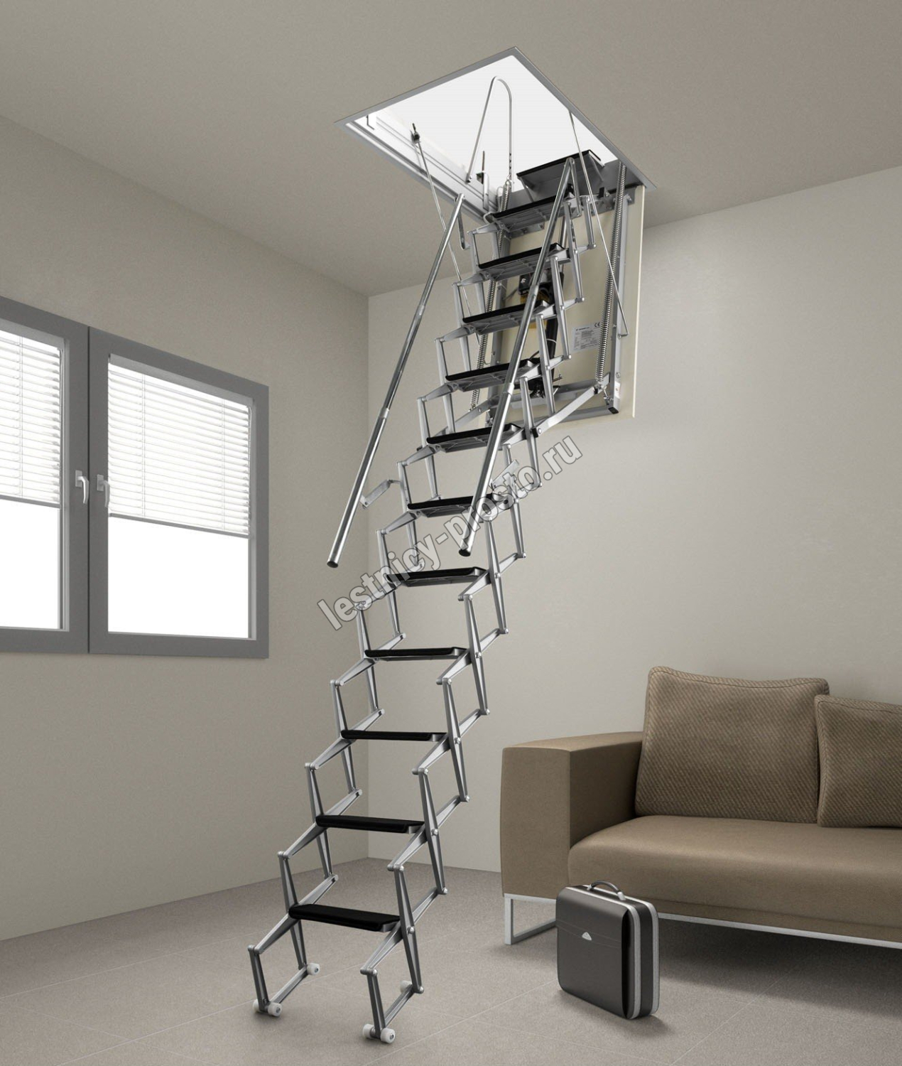Автоматическая раздвижная ножничная чердачная лестница, с электромотором для дистанционного открывания.