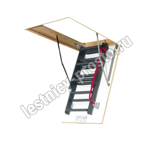 Герметичность всей конструкции достигается благодаря утеплению крышки люка и контурному уплотнению по периметру, что предотвращает возможные теплопотери. Чердачную лестницу очень легко разложить и сложить благодаря наличию специального стержня с четырехугольной насадкой. Установленные в лестнице угловые петли-шарниры нового образца придают ей высокую прочность и надежность, а также предохраняют короб от возможной деформации. Основное преимущество чердачной складной металлической лестницы LMK сводится к ее небольшим габаритам при сохранении высокой функциональности, прочности, надежности и эстетичности конструкции. Монтировать лестницу очень просто, для этого не придется затрачивать много времени и сил. Применение лестничной конструкции этого типа позволяет существенно экономить пространство. Монтажный комплект LXK в комплекте не поставляется.