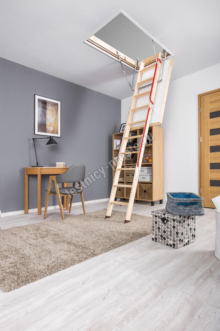 Складная чердачная лестница LWL имеет повышенные теплоизоляционные параметры и высокий класс герметичности. Утеплённая крышка люка белого цвета. Лестница оборудована специальным механизмом LXM-3 и крючком на нижней ступени марша для стержня, которые в комплексе обеспечивают лёгкость и плавность открывания и закрывания лестницы. Снабжена дополнительным поручнем для безопасного подъёма.