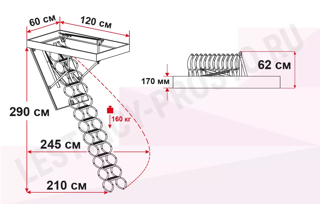 С помощью дополнительных секций (покупаются отдельно) базовую высоту лестницы можно увеличить до 3150 мм. или до 3400 мм.