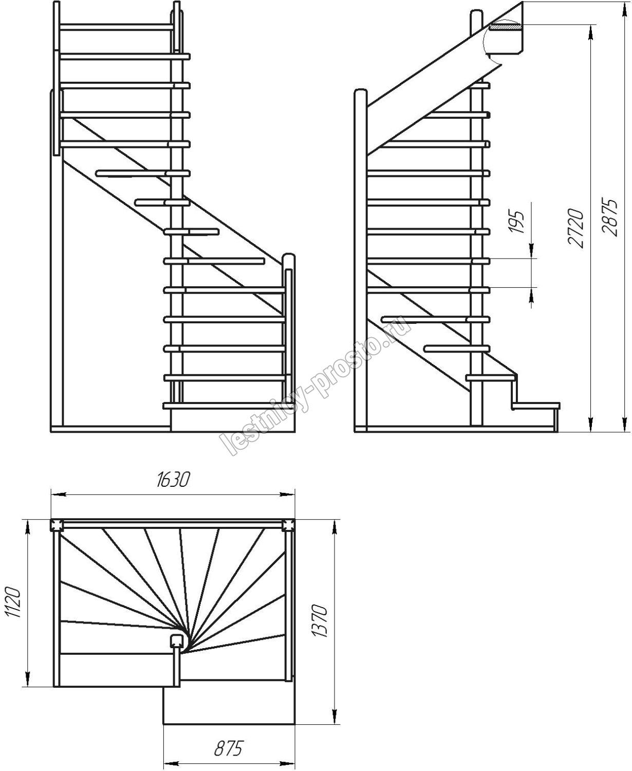 Деревянная межэтажная лестница ЛЕС-01 2720-2920 проем 1630-1120, Сосна