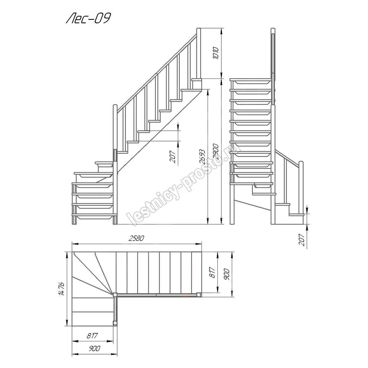 | Деревянная межэтажная лестница ЛЕС-09 2900 проем 2580-900, Лиственница |