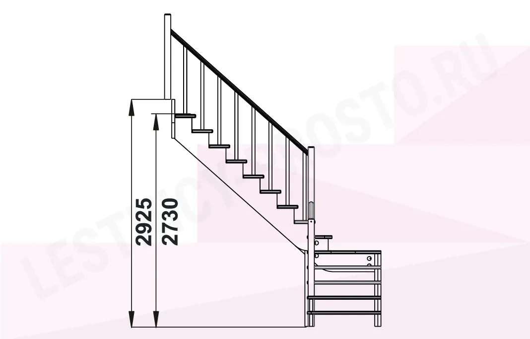 Ступени и поручень лестинцы изготовлены из бука, остальные элементы из сосны. Возможно изготовление данной модели полностью из бука. Базовый комплект включает в себя деревянные элементы лестницы и ограждения без какого-либо покрытия.