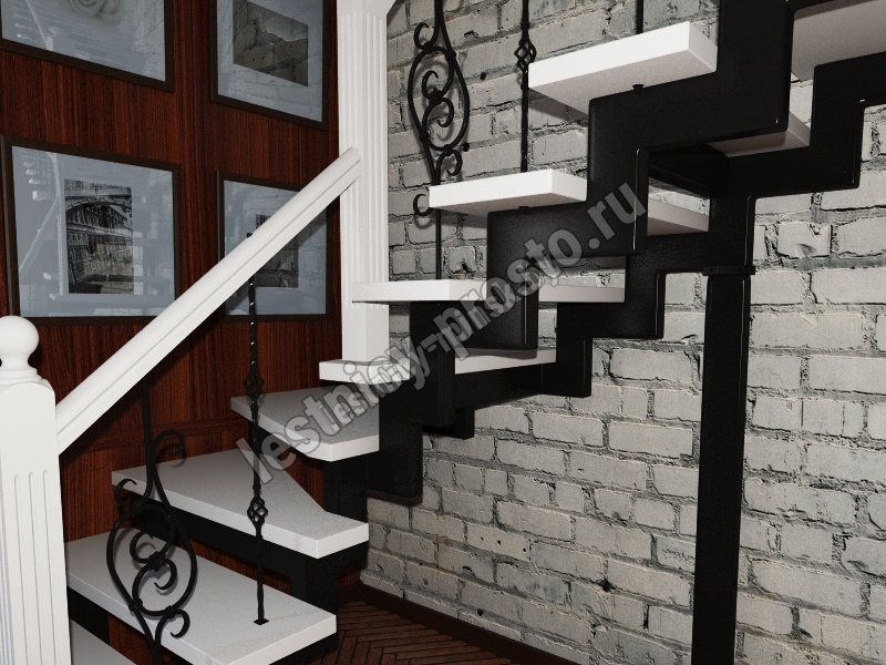 Кованые элементы и деревянные столбы можно выбрать по каталогу (после оформления заказа, мы вышлем вам фото образцов). Деревянные элементы: столбы и поручень по умолчанию идут без окрашивания, металлические элементы окрашены в цвет каркаса лестницы. Ограждение начинается со второй ступени.