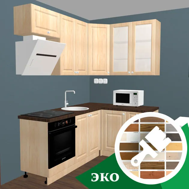 Угловой кухонный гарнитур из 100% массива сосны размером 2 на 1,4 и высотой 2,32 м (в данном проекте использованы высокие верхние ящики 90 см). Цвет на выбор - более 20 вариантов (при заказе кухни в нашем интернет магазине просьба указывать название цвета в комментариях).