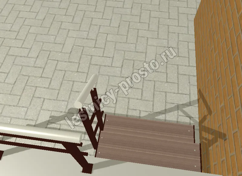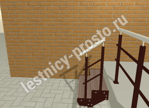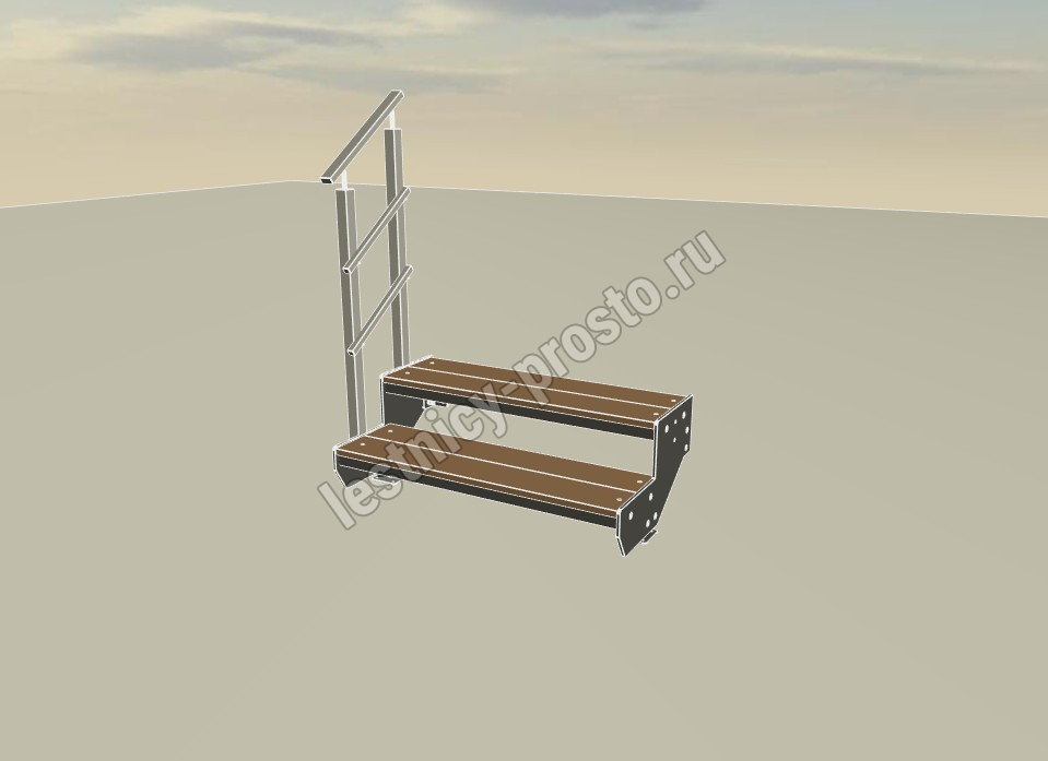 Ступени лестницы состоят из металлической рамки, обеспечивающей необходимую прочность, и покрытия из террасной доски ДПК (древесно-полимерный композит). Ступени не боятся воды и мороза, не теряют со временем свой внешний вид и не требуют ухода.