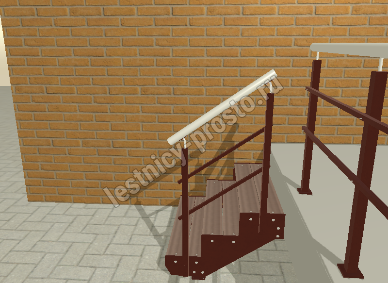 Ступени лестницы состоят из металлической рамки, обеспечивающей необходимую прочность, и покрытия из террасной доски ДПК (древесно-полимерный композит). Ступени не боятся воды и мороза, не теряют со временем свой внешний вид и не требуют ухода.
