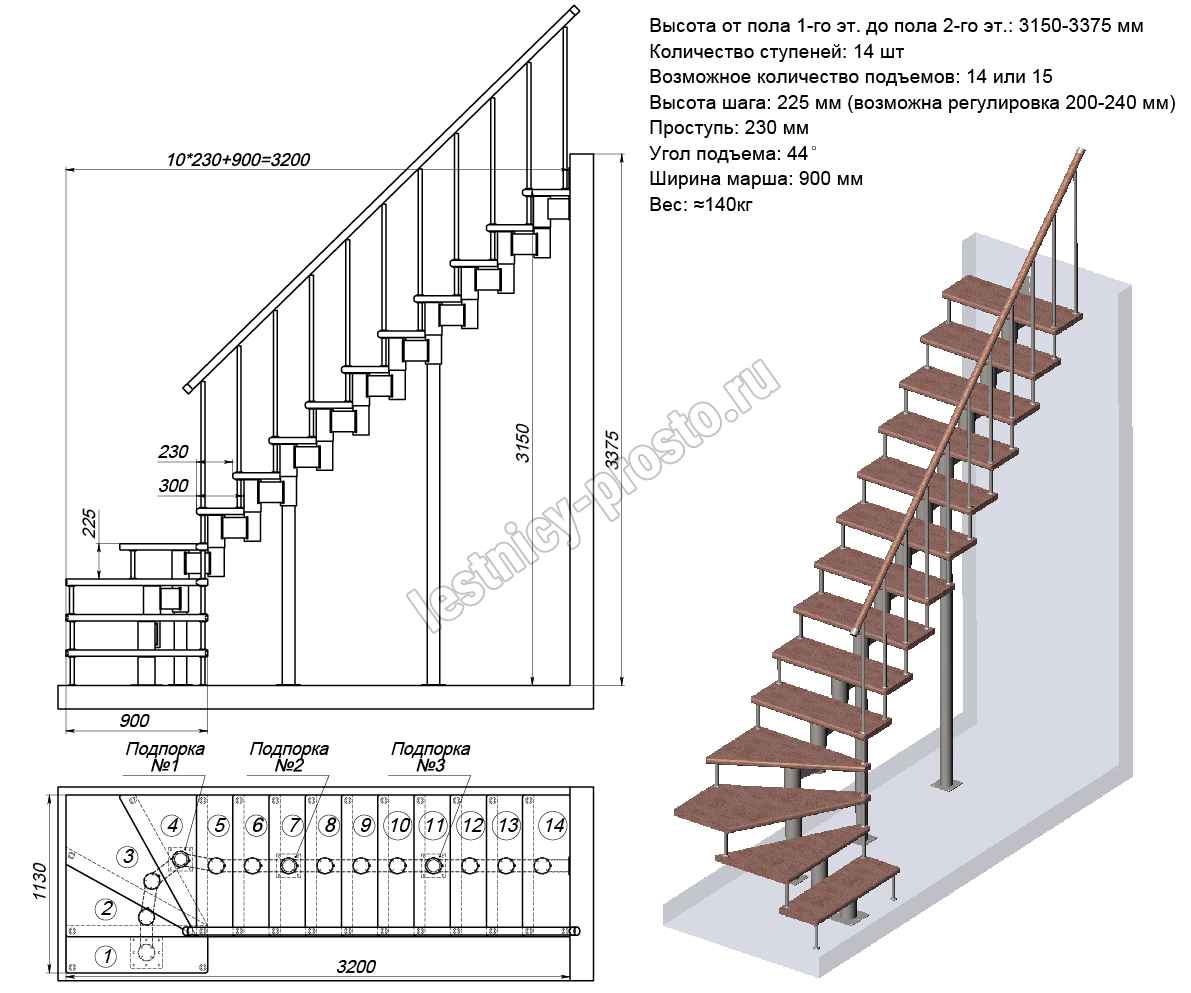 Высота лестницы 3150 - 3375 (14 ступеней) мм