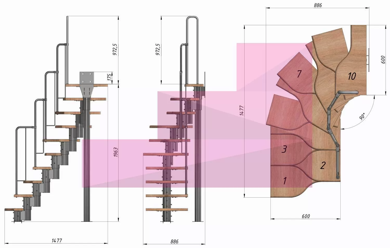 - Регулируемый по высоте в пределах 180-240 мм модуль. Большой диаметр и толщина металла деталей обеспечивают жесткость и прочность конструкции. Регулировка каждого модуля по высоте позволяет легко приспособить лестницу под ваше помещение.