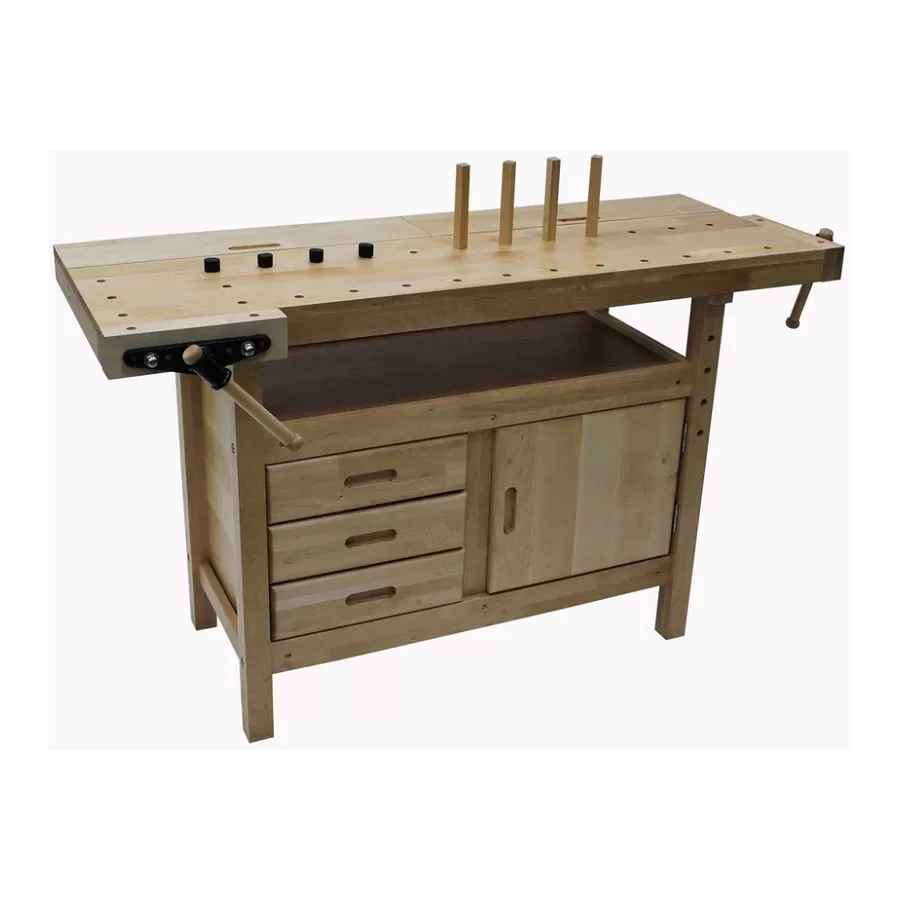 Комплектация: 1 тиски, 2 пенала в столешнице, 2 выдвижных ящика, полка для инструментов.
