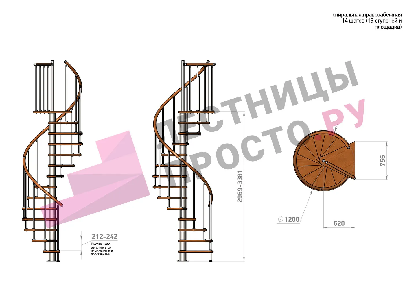 Высота ступеней регулируется с шагом 3 мм. в пределах 212-242 мм., благодаря чему, лестница прекрасно подгоняется под необходимую высоту.